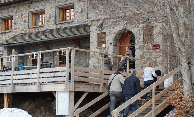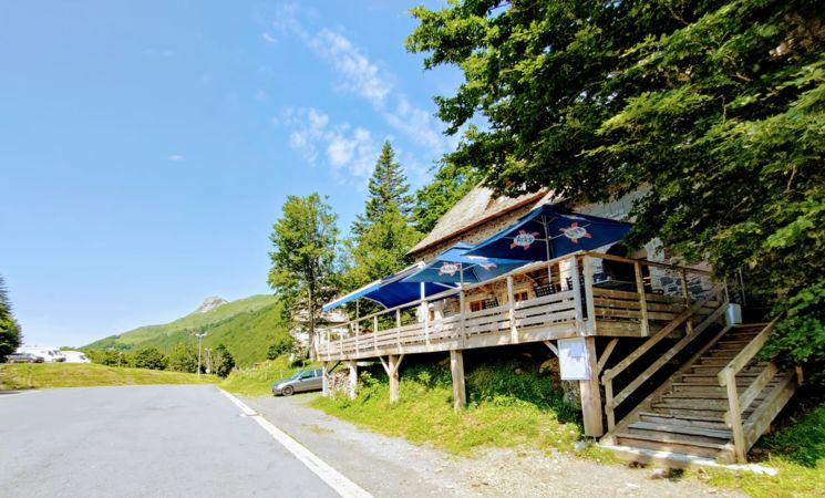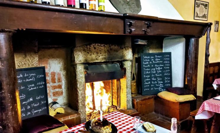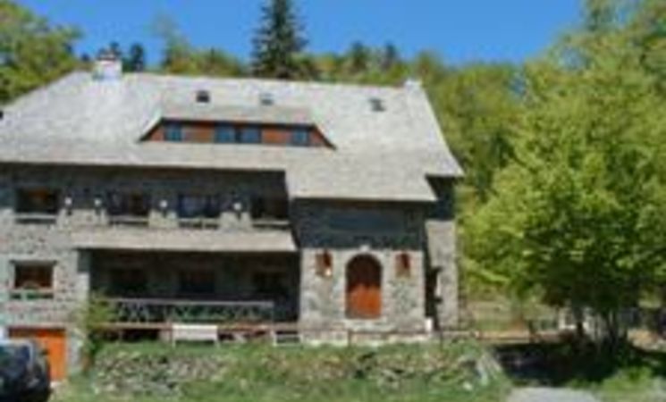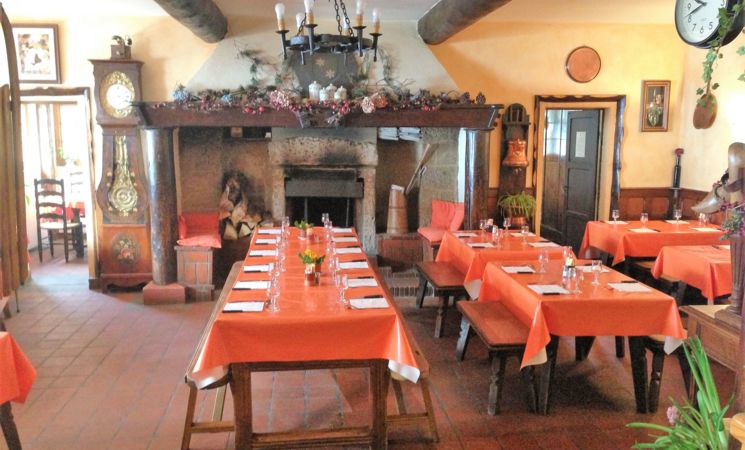Posada tradicional de piedra, ambiente rústico con chimenea y gran terraza. Cocina tradicional y especialidades de Auvernia: truffade, chou farçi, pounti…
