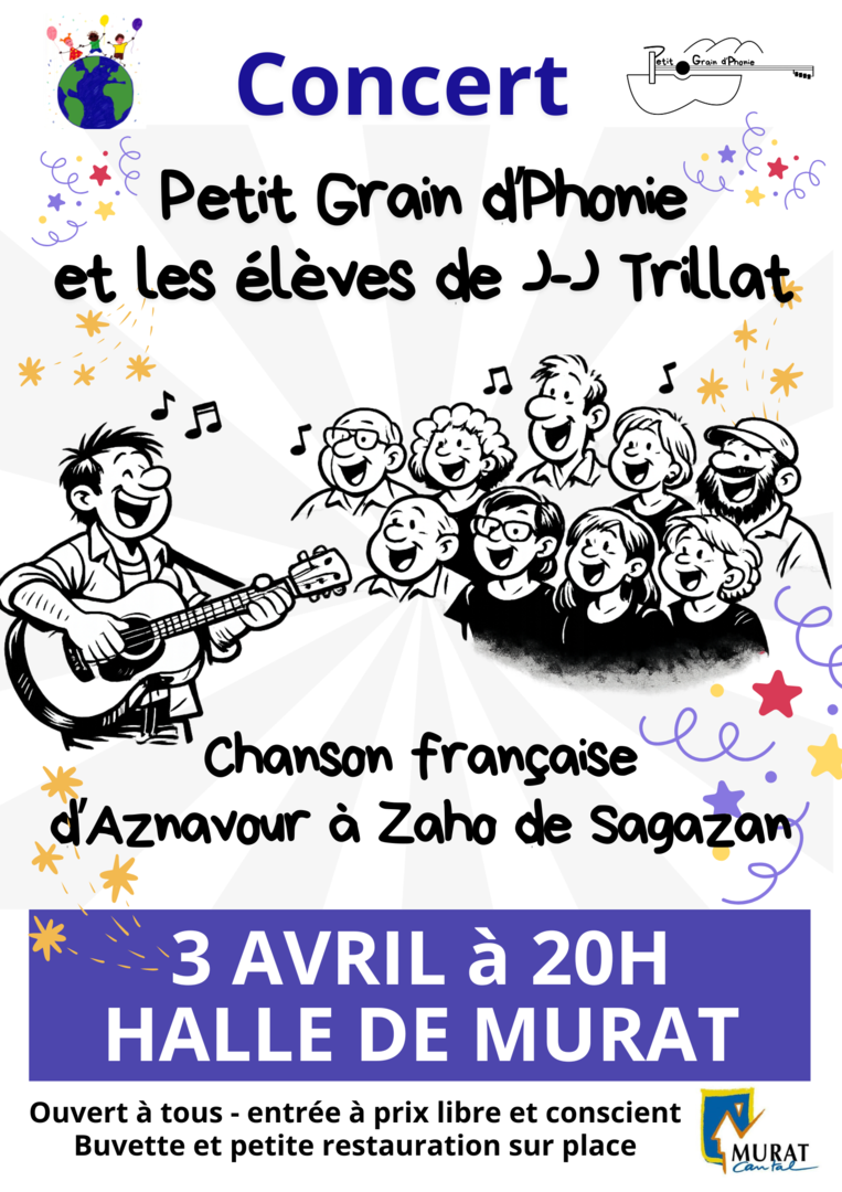 L’APE de Murat vous propose une soirée « Chansons françaises » mettant de concert les élèves de l’école J-J Trillat et le groupe vocal Petit Grain d’Phonie