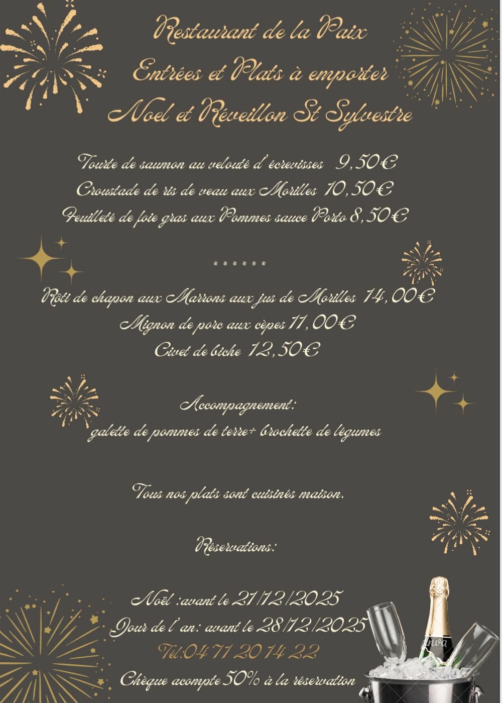 Entrées et plats à emporter pour noël et le Réveillon de la Saint Sylvestre, voir affiche pour le détails
